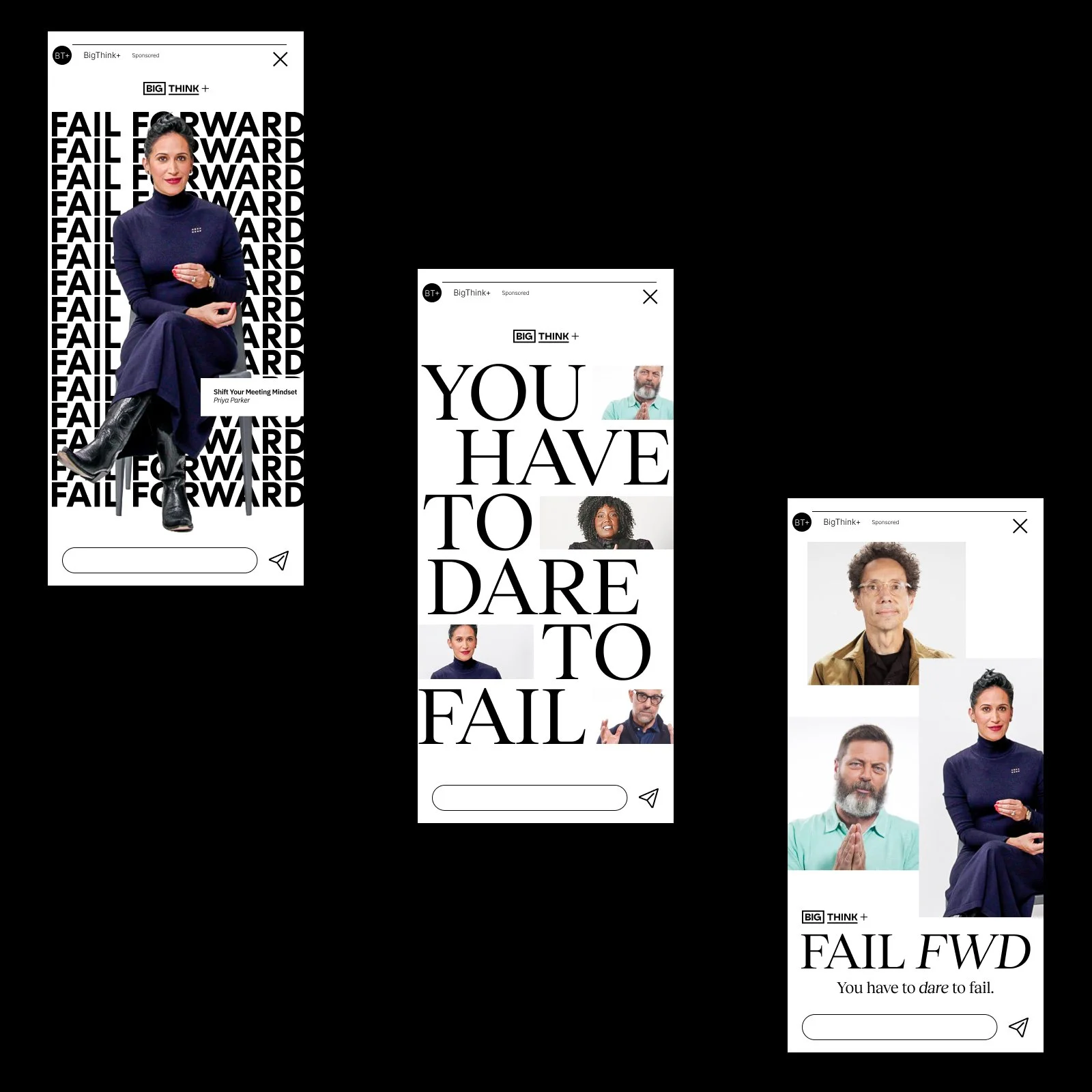 BIGTHINK+ is an organization driven by radical curiosity. Part coaching program, part idea lab, part community platform, they exist to empower raw, untapped minds to unleash their best and most badass selves with over 500+ best-selling authors, elite business leaders, world-renowned psychologists, and more. BIGTHINK+ empowers people to go from learner to leader by failing quickly. I helped establish BigThink+'s new identity system and provided the overall campaign message that the only guarantee in learning is failing forward.